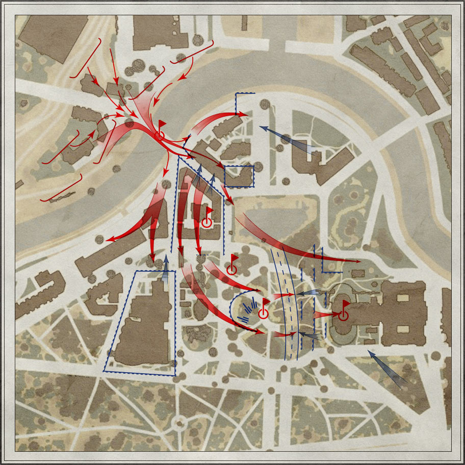 Дорога к главному символу гитлеровской Германии очень выгодна обороняющимся. Открытая всем ветрам площадь усеяна грамотно организованными укреплениями. Даже затопленный котлован метро станет эффективной преградой на пути советских солдат и танкистов.