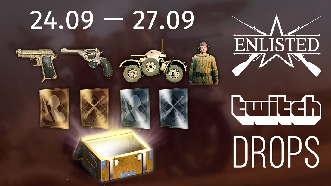 Смотрите стримы по Enlisted на Twitch с пометкой “Drops включены!” в период с 24 сентября (18:00 МСК) по 27 сентября (18:00 МСК).