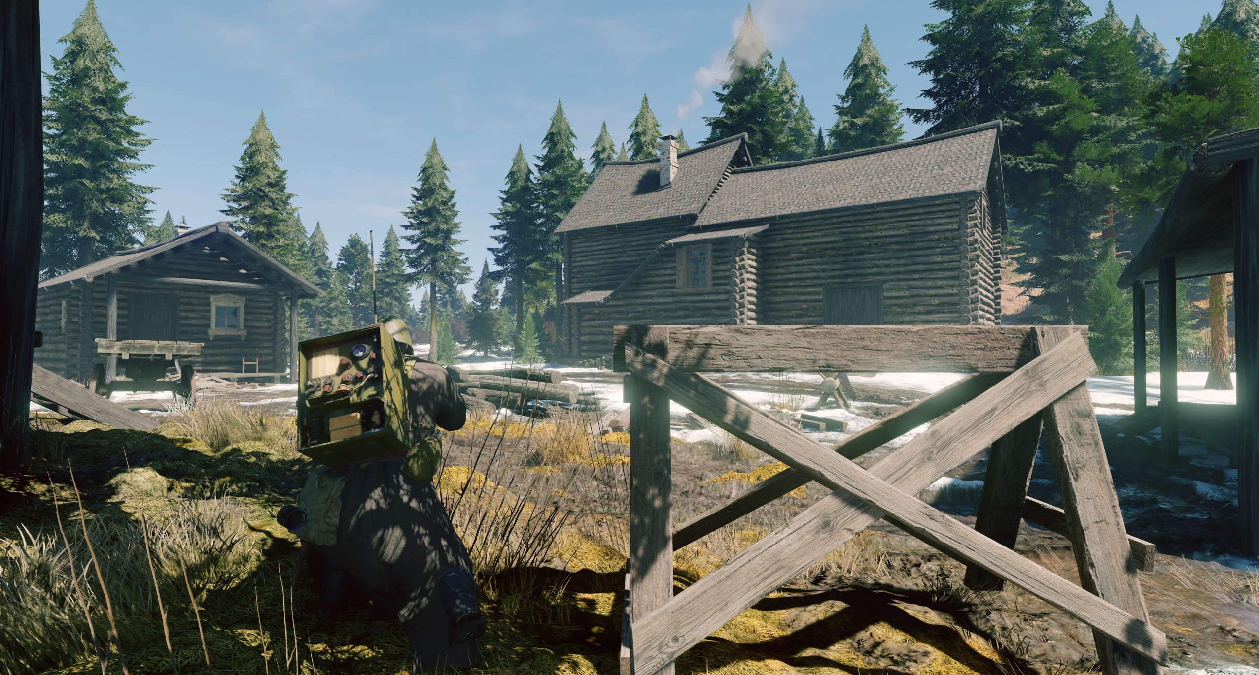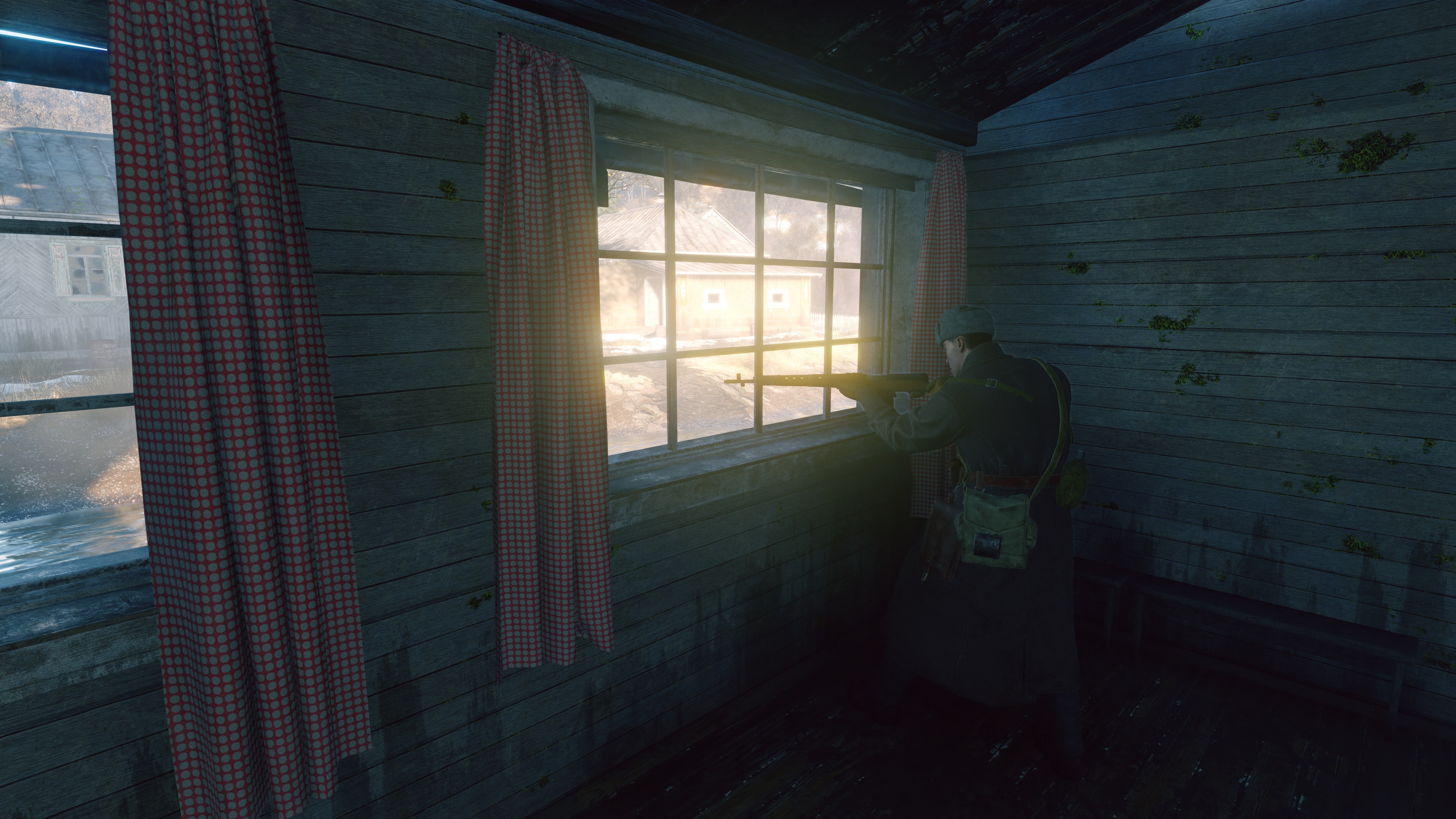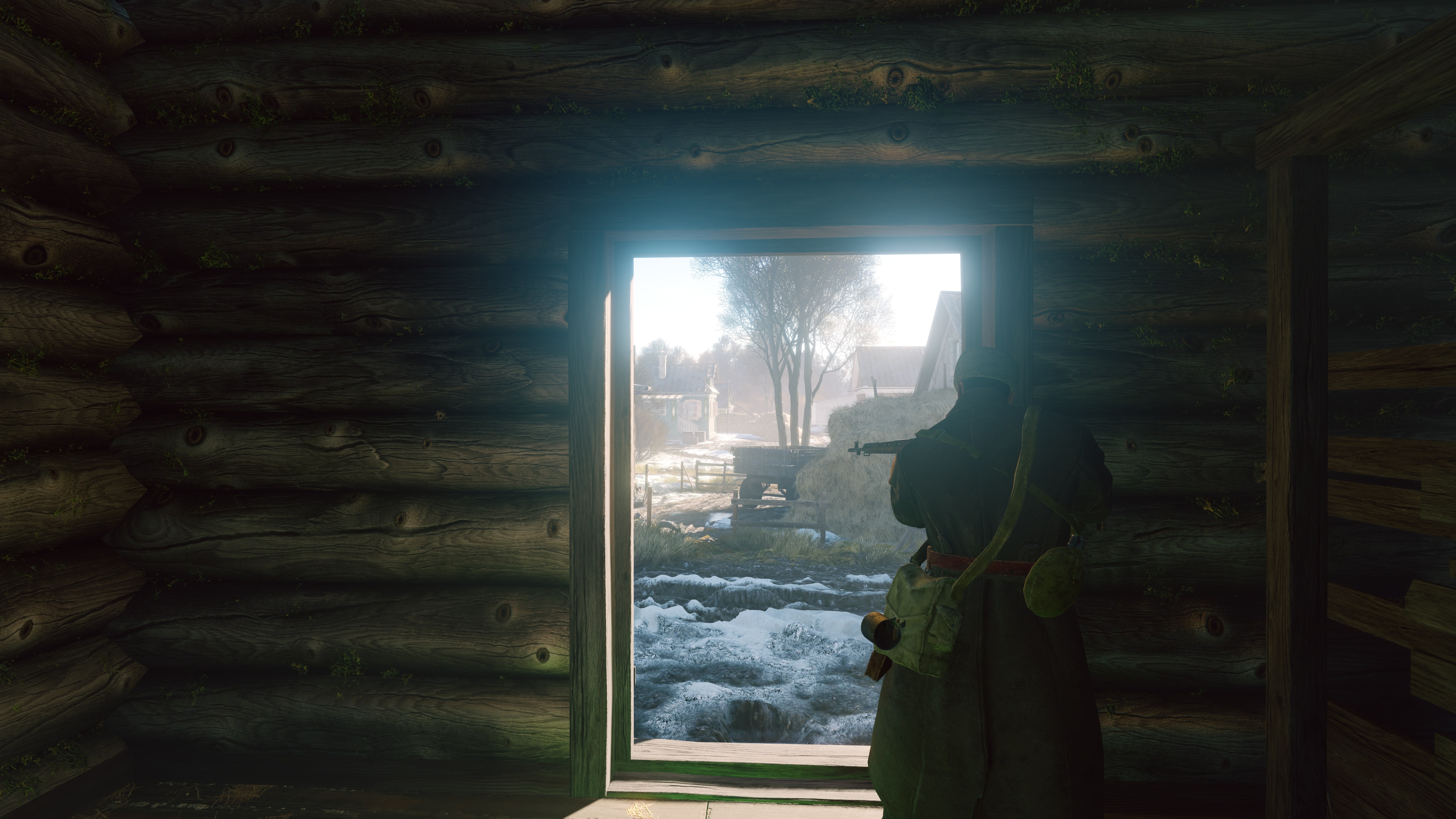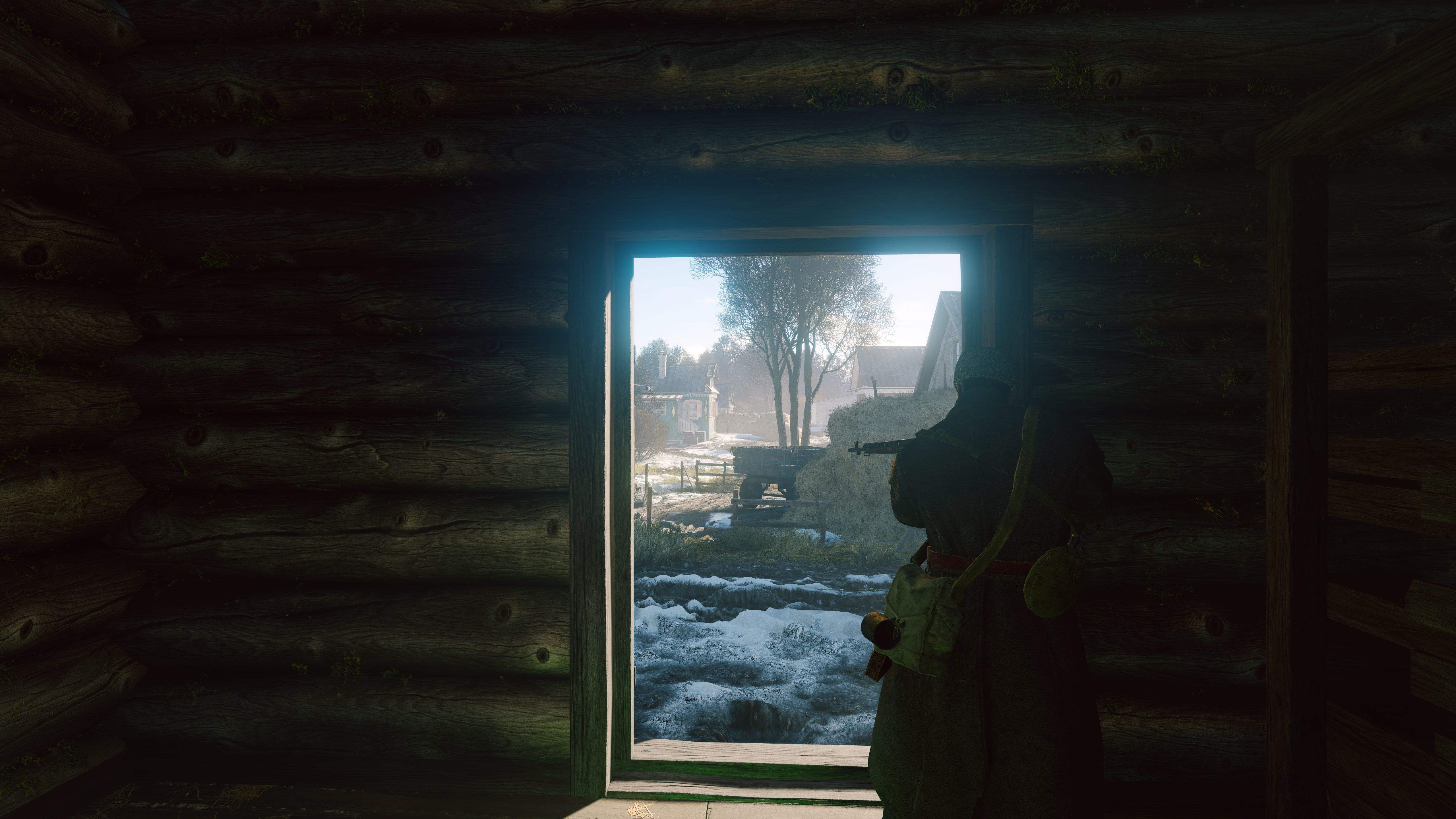 Тёмные бревенчатые дома. Адаптация делает их спокойно-серыми, и они смотрятся неплохо, но такая экспозиция приводит к тому, что снег и небо в окнах «слепит». Разумеется, для игрового процесса было бы лучше, если бы глаз не адаптировался так сильно к тёмному дереву — ведь наше внимание в немалой степени приковано к тому, что находится за окном.